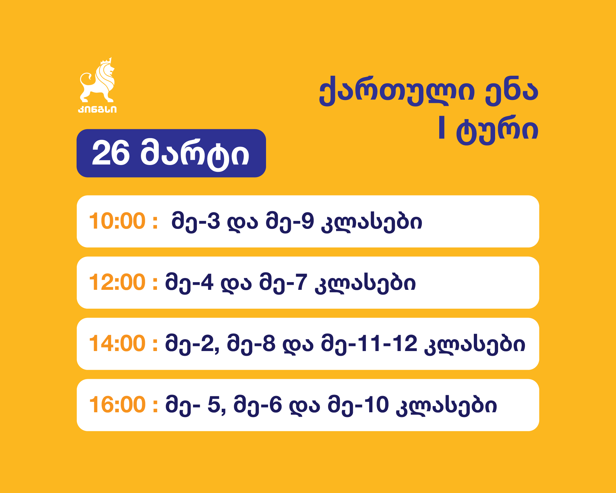 ქართული ენის პირველი ტური, 26 მარტს ჩატარდება შემდეგი განრიგით (გთხოვთ, მობრძანდეთ მითითებულ დრომდე მინიმუმ 15 წუთით ადრე):
