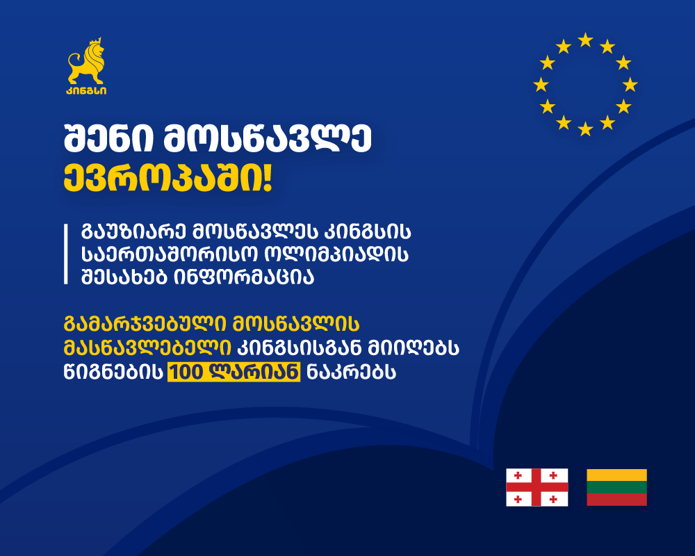 კინგსის საერთაშორისო ოლიმპიადა ტარდება მე-2-დან მე-8 კლასის ჩათვლით მოსწავლეებისათვის ინგლისურ ენასა და მათემატიკაში. პირველი შესარჩევი ტური იმართება საქართველოში, ფინალურ ტურზე კი საქართველოს ნაკრები, 14 გამარჯვებული მოსწავლე, კინგსის სრული დაფინანსებით მიემაგზავრება ევროპაში, ქალაქ ვილნიუსში, გამარჯვებული ქვეყნის ტიტულის მოსაპოვებლად.