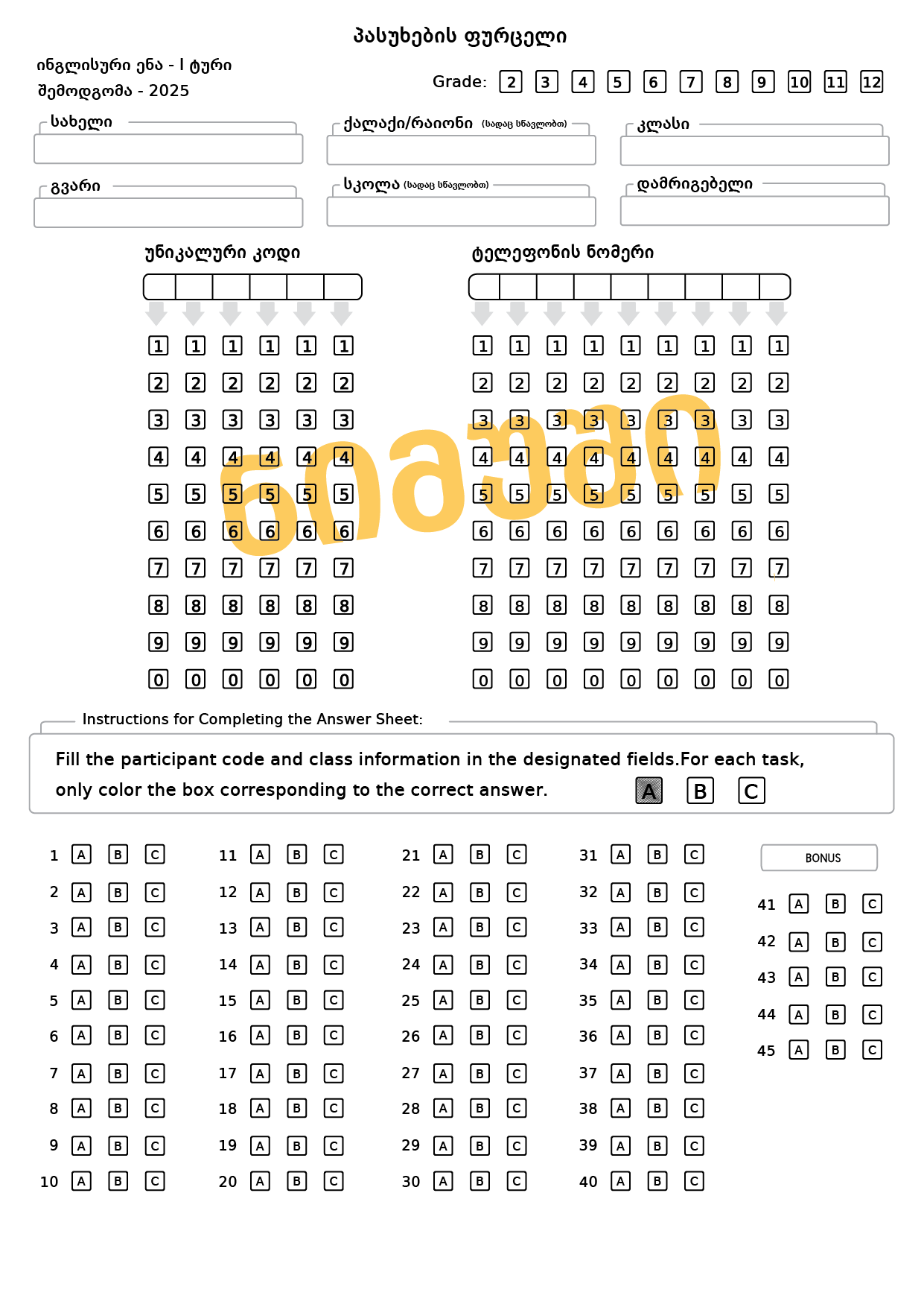 პასუხის ფურცლის ნიმუში კი იხილეთ ამ ბმულზე: ბმული