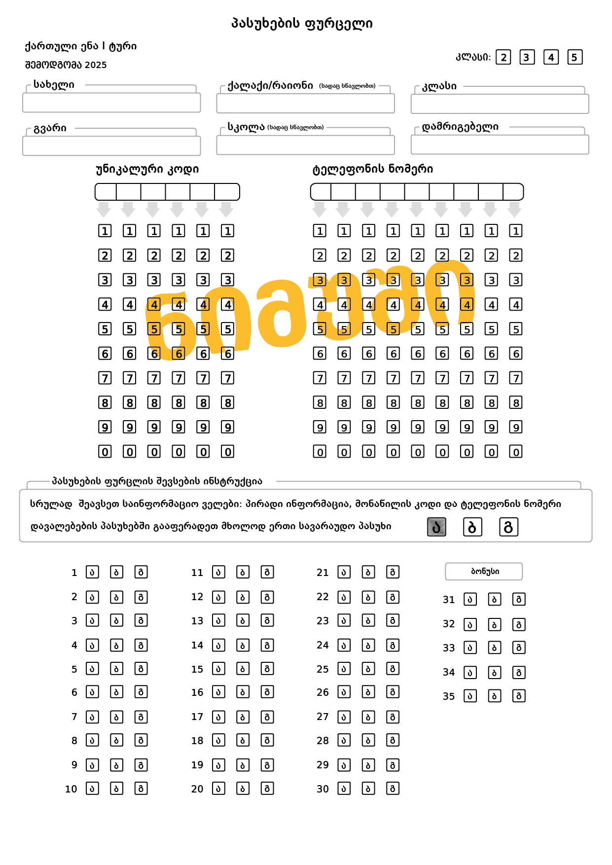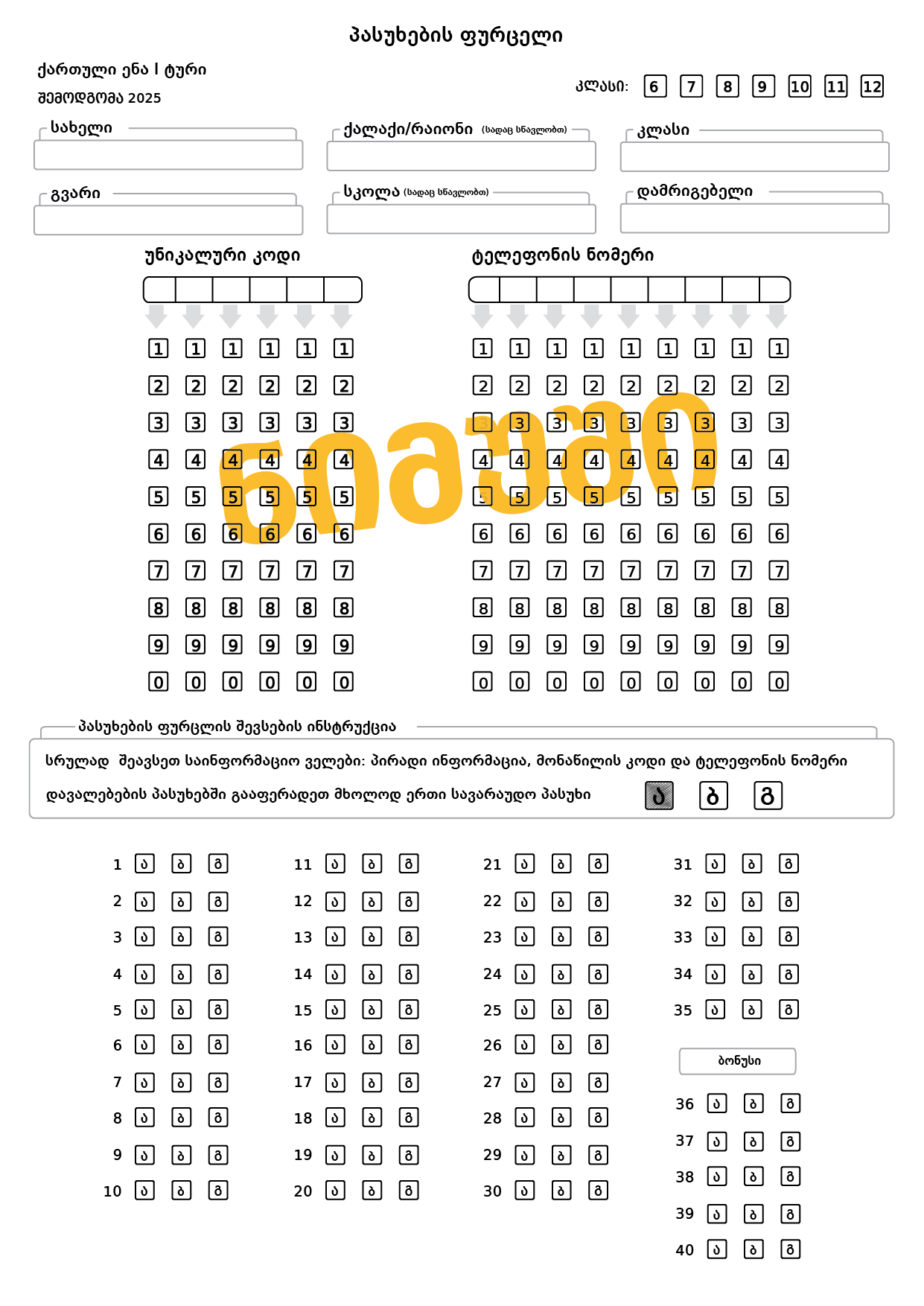 პასუხის ფურცლის ნიმუში კი იხილეთ ამ ბმულებზე: