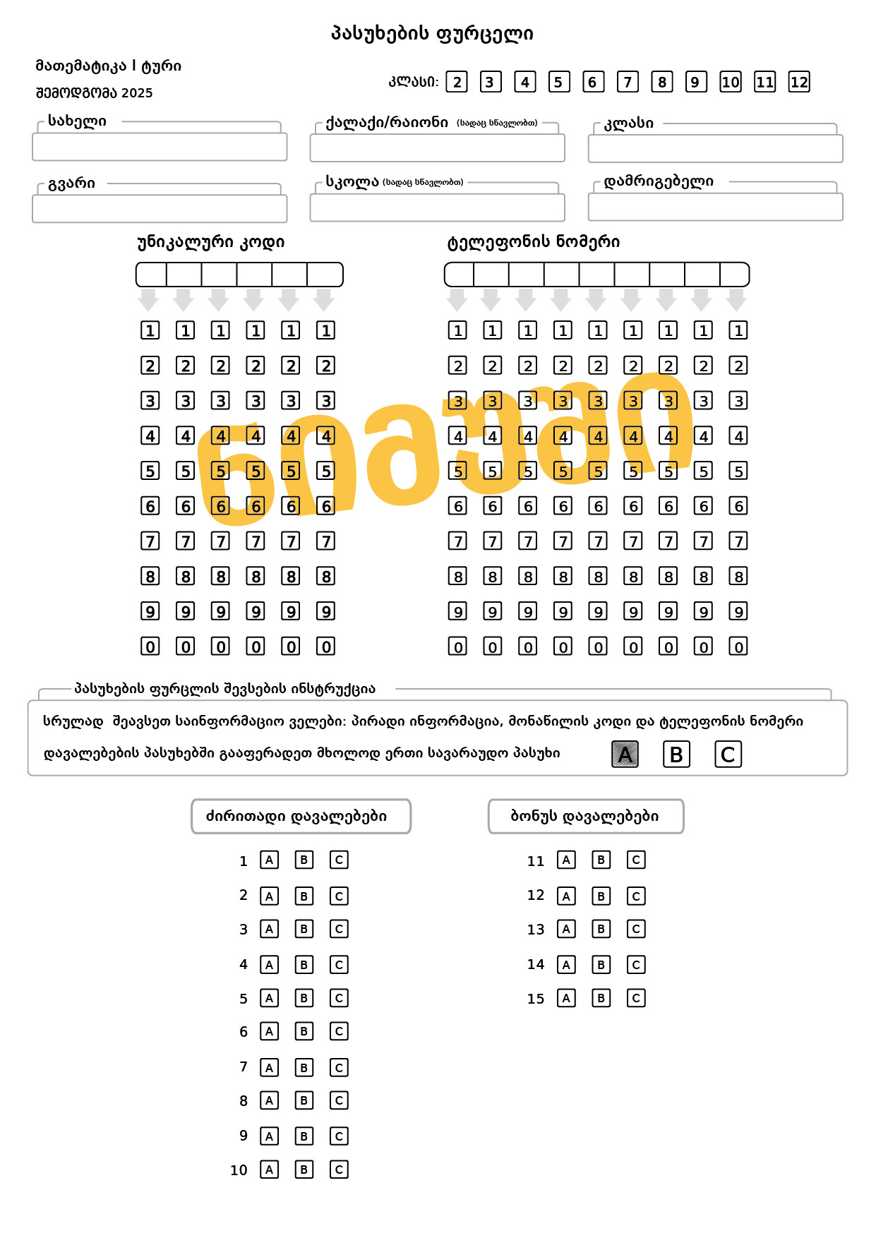 პასუხის ფურცლის ნიმუში იხილეთ ბმულზე: ნიმუში