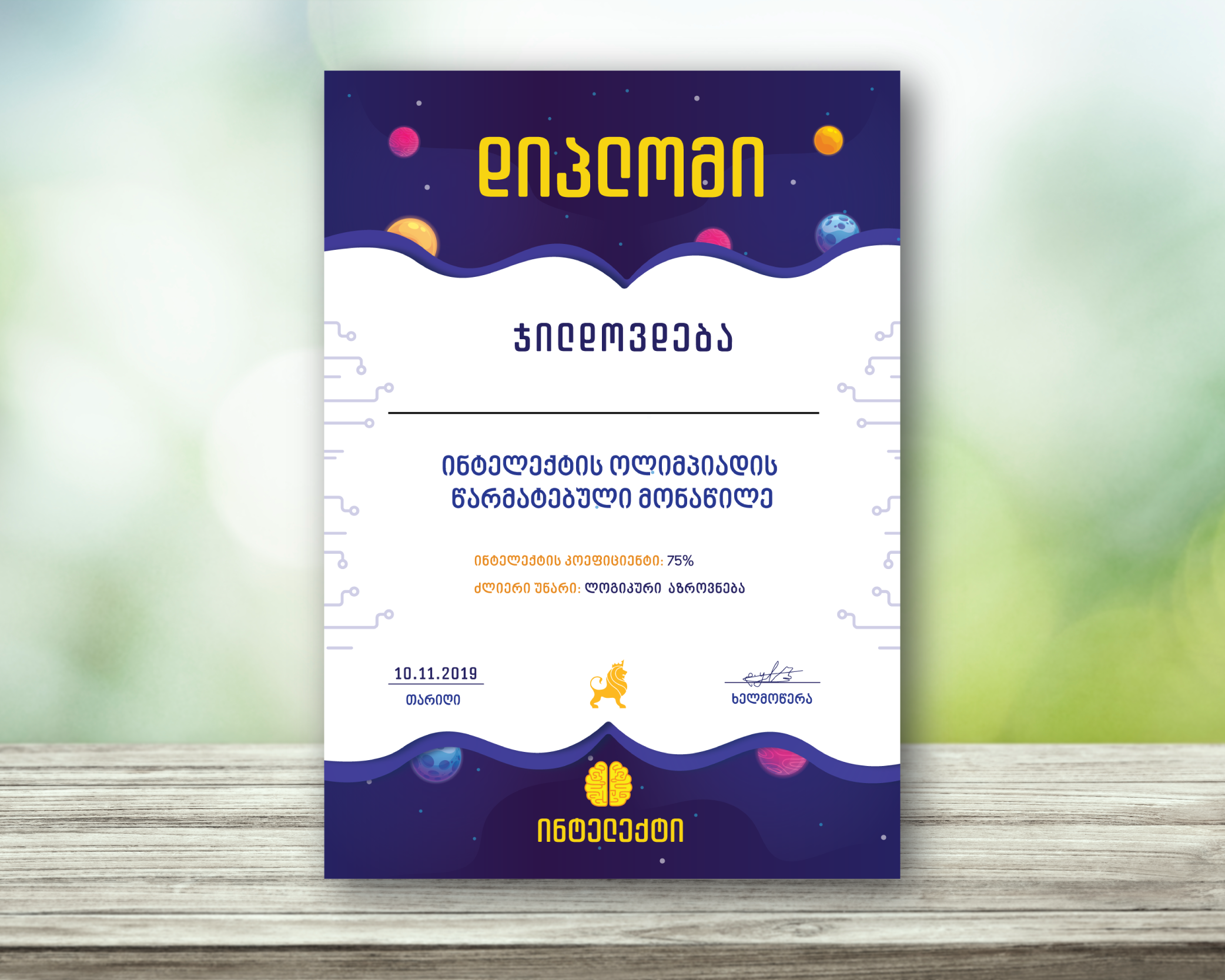 ინტელექტის ოლიმპიადის ფინალის მონაწილეებს განსაკუთრებული დიპლომები გადაეცემათ, რომელიც პროცენტულად შეაფასებს მათი ინტელექტის დონეს და 7 კომპონენტიდან გამოყოფს მათ, რომელშიც მოსწავლე ყველაზე ძლიერია 😊